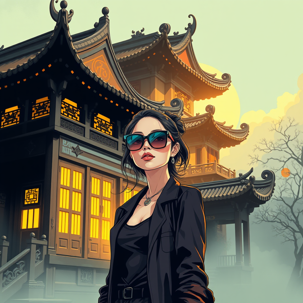 A woman in stylish sunglasses stands confidently beside an ancient, ornate house, blending cyberpunk manga aesthetics with the vibrant creativity of Ross Tran. The scene is infused with Chinese iconography, where deep black shadows contrast with glowing light amber hues, creating bold graphic illustrations. This fusion of Chinese tradition with a futuristic twist features intricate, multi-layered color fields that add depth and complexity to the composition, balancing traditional elements with modern flair.