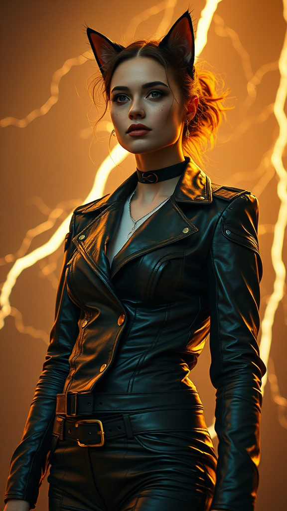 A woman is adorned in a cutting-edge black leather suit, embodying the essence of animated gifs, enveloped in soft-focused realism with splattered and dripped textures. She is bathed in a warm golden light, surrounded by dynamic lightning waves. Her ensemble hints at a neo-Victorian influence with a dash of catcore whimsy, captured in an elongated aspect ratio that enhances her enigmatic presence. The scene exudes a captivating blend of futuristic elegance and eclectic charm.