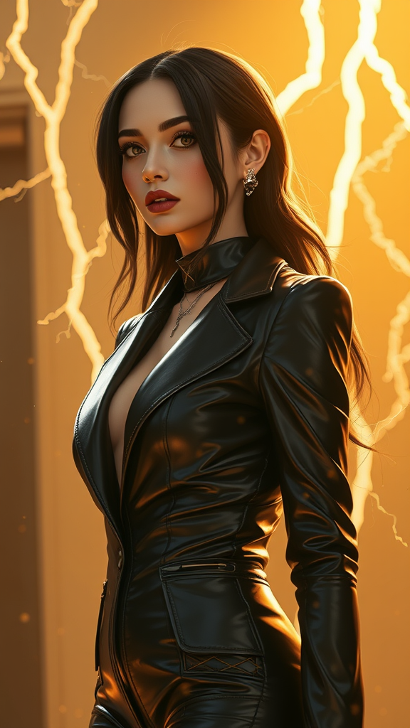 A woman is clad in a sleek, futuristic black leather suit, embodying a blend of sharp animated gif aesthetics and soft-focused realism. The scene is bathed in a golden light, with dynamic splatters and drips adding texture. Lightning-like energy pulses around her, interwoven with elements of catcore whimsy and neo-Victorian elegance, creating a captivating visual narrative.