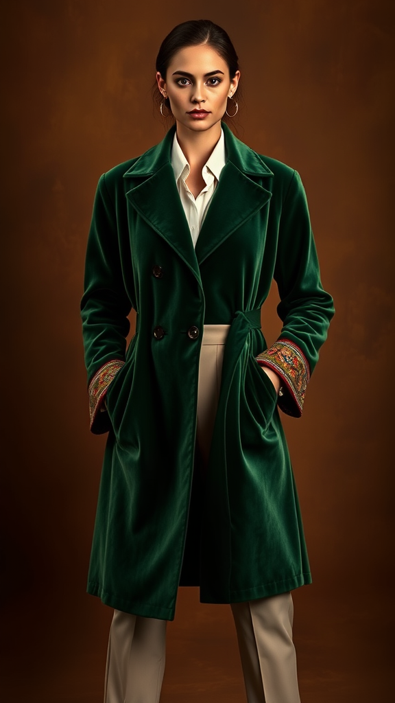 A woman model standing confidently in a fashion-forward pose, set against a warm, dark brown background. She's wearing an elegant green velvet coat adorned with intricate Persian carpet patterns around the cuffs and collar, giving the coat a distinct artistic flair. Underneath, a silky white blouse peeks through, adding a touch of classic sophistication. Her look is completed with tailored beige trousers that blend seamlessly with her entire ensemble, creating a harmonious balance between traditional patterns and modern elegance. The model's strong expression and the subtle play of light and shadow enhance the rich textures of her attire, perfecting the captivating and contemporary fashion cover aesthetic.