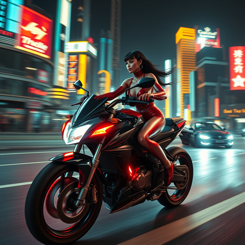 A woman on a motorcycle in a thrilling high-speed chase through a futuristic urban landscape, surrounded by neon-lit cityscapes, wearing sleek red and black attire that clings to her form. Her motorcycle is adorned with vibrant, pulsating lights that cast a kaleidoscope of colors. The scene is captured with a sense of motion blur and virtual distortion, emphasizing the speed and intensity of the pursuit. The streets glow in the night, creating an atmosphere of darkness and tension, heightened by dramatic lighting that casts sharp shadows. This cinematic scene is enhanced by a film grain texture, achieving a photorealistic quality in 4K resolution. The artwork remains a masterpiece of concept art, achieving high resolution, illustrating an epic action sequence, exuding excitement and energy without extraneous elements like additional limbs or fingers, unrealistic roads, boring colors, or monochromatic designs.