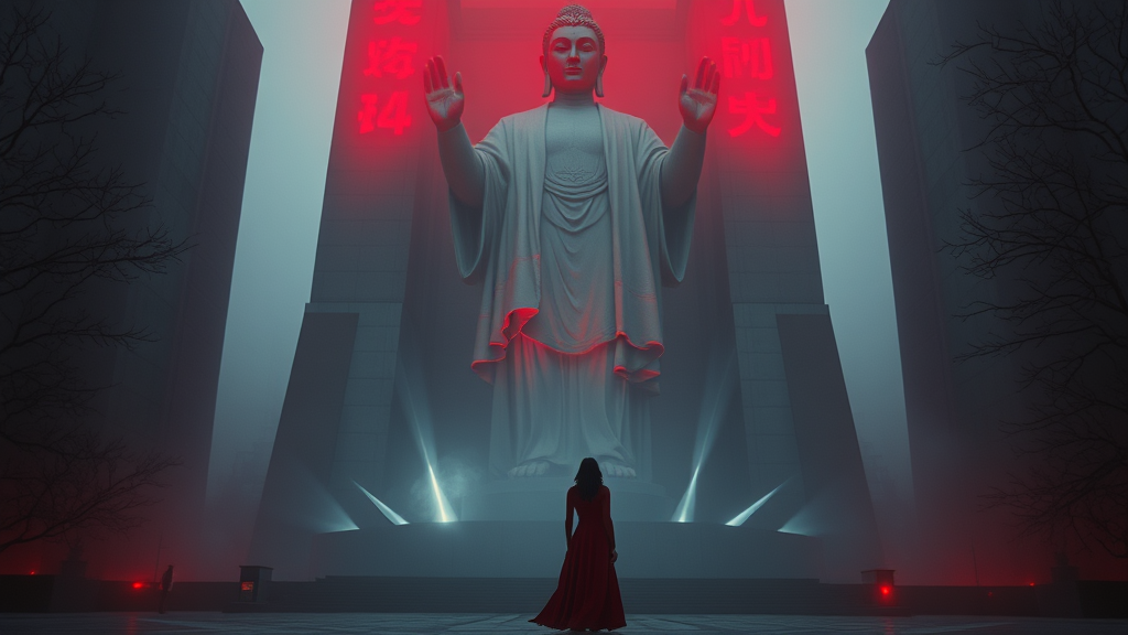 A woman poised before an enormous statue in a dramatic cinematic setting, inspired by the artistry of Fenghua Zhong and Alessio Albi. The scene bathes in a palette of rich reds and muted grays, reminiscent of Cliff Chiang's works. The environment exudes a filmic quality, embodying meticulous attention to detail and technique, akin to a masterfully crafted video scene. The composition captures the grandeur and intimacy of the moment, evoking a sense of wonder and contemplation in the face of monumental artistry.