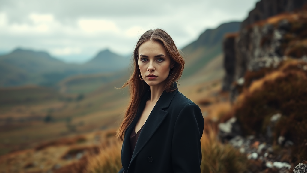 A woman poses amidst a sprawling Scottish landscape, her attire blending seamlessly with the natural surroundings, invoking the styles of Daria Endresen and Kris Knight. Her outfit is a sophisticated combination of light navy and dark brown hues, reminiscent of Georg Jensen's elegant designs. The scene is captured in an intense close-up, focusing on her serene expression, with the matte photo finish evoking a sense of timeless beauty.