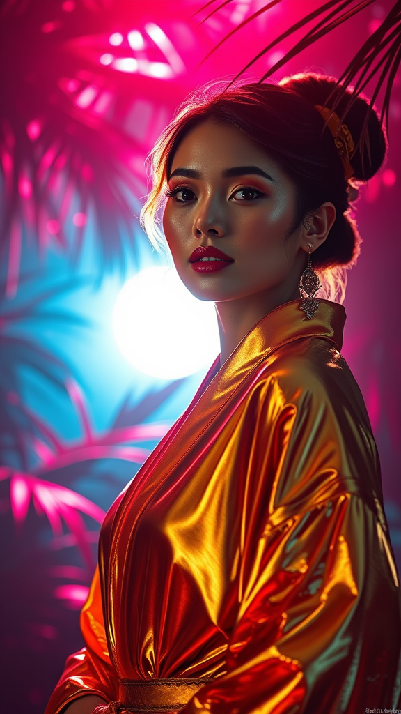 A woman radiates elegance in a glossy golden kimono shimmering under the sun, embodying a cyberpunk realism. She stands amidst an enigmatic tropical landscape bathed in luminous light, reminiscent of glamorous Hollywood portraits. Her expression is captured in an intensely detailed close-up, with digital neon accents reflecting off her attire. Influences of Wong Kar-wai and metallic textures blend seamlessly, echoing the explosive vibrancy often seen in the works of Artgerm. A backdrop of dark pink and light blue hues enhances the atmosphere, reminiscent of Tanya Shatseva's intricate digital manipulation style. Elements of Daniel F. Gerhartz's artistry weave through the composition, resulting in an ultra-high-definition image that portrays a dynamic interplay of light and shadow. Within this composition, the intensity of beauty and technology converge, creating a spellbinding visual narrative.