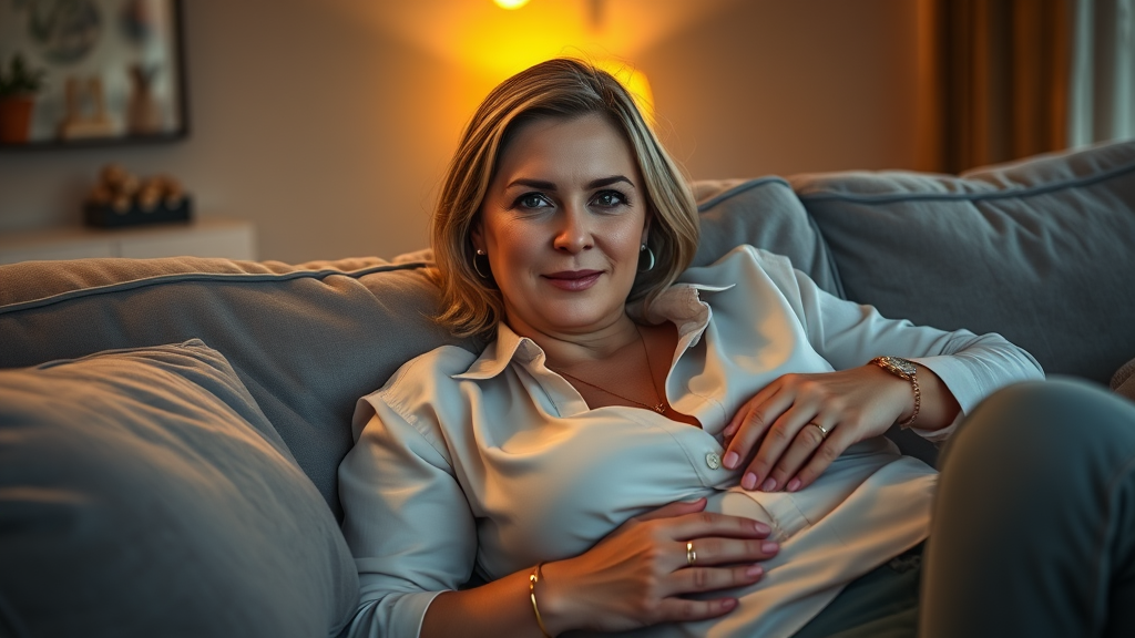 A woman reclines comfortably on a luxurious sofa in her inviting living room, her eyes meeting the viewer's with a blend of assurance and allure. Her light blue eyes shimmer like sapphires in the gentle, amber light that envelopes the room. She leans on one arm, with her other hand resting softly on her stomach, as she nestles into the cushions. The fitted, delicate fabric of her collared blouse emphasizes her generous silhouette, teasingly exposed by a couple of undone buttons. A gold bracelet graces her wrist, adding a touch of elegance and sophistication to the scene. As the twilight sun begins to set, the room glows with a warm, intimate ambiance, creating a sense of a private refuge shared solely between the woman and the viewer.
