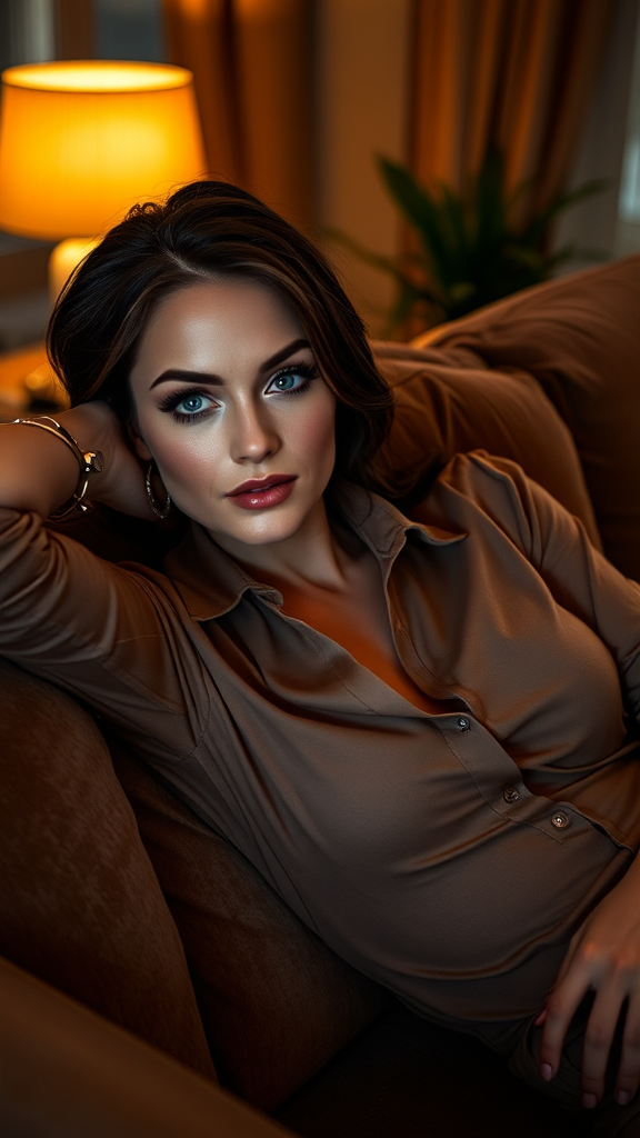A woman reclines gracefully on a lush velvet couch in her inviting living room, her gaze meeting the viewer's with a mix of allure and poise. Her azure eyes shimmer like precious stones in the gentle, amber light that fills the room. She rests on one arm, her other hand lightly placed on her lap as she melts into the cushions. The fitted, soft material of her collared blouse clings delicately to her form, teasingly unbuttoned to reveal a hint of her neckline. A silver bracelet accentuates her wrist, adding an element of elegance and charm to the scene. As the twilight descends, the room glows with a mellow, tender light, creating a secluded retreat shared solely between the woman and the viewer.