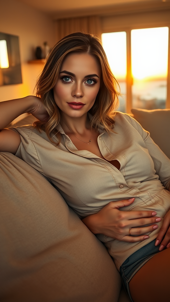 A woman reclines gracefully on a luxurious sofa in her inviting living room, her gaze meeting the viewer's with a blend of confidence and allure. Her captivating blue eyes catch the soft, golden light that envelops the room, resembling sparkling sapphires. She rests on one arm, her hand gently placed on her abdomen as she sinks into the plush cushions. The fitted, delicate fabric of her collared button-down shirt hugs her figure, revealing a hint of her neckline as the top buttons remain undone. A delicate gold necklace adds a touch of elegance and glamour to her appearance. As the evening sun sets beyond the horizon, the space is suffused with a warm, intimate glow, creating a sense of a secluded haven shared exclusively between the woman and the viewer.