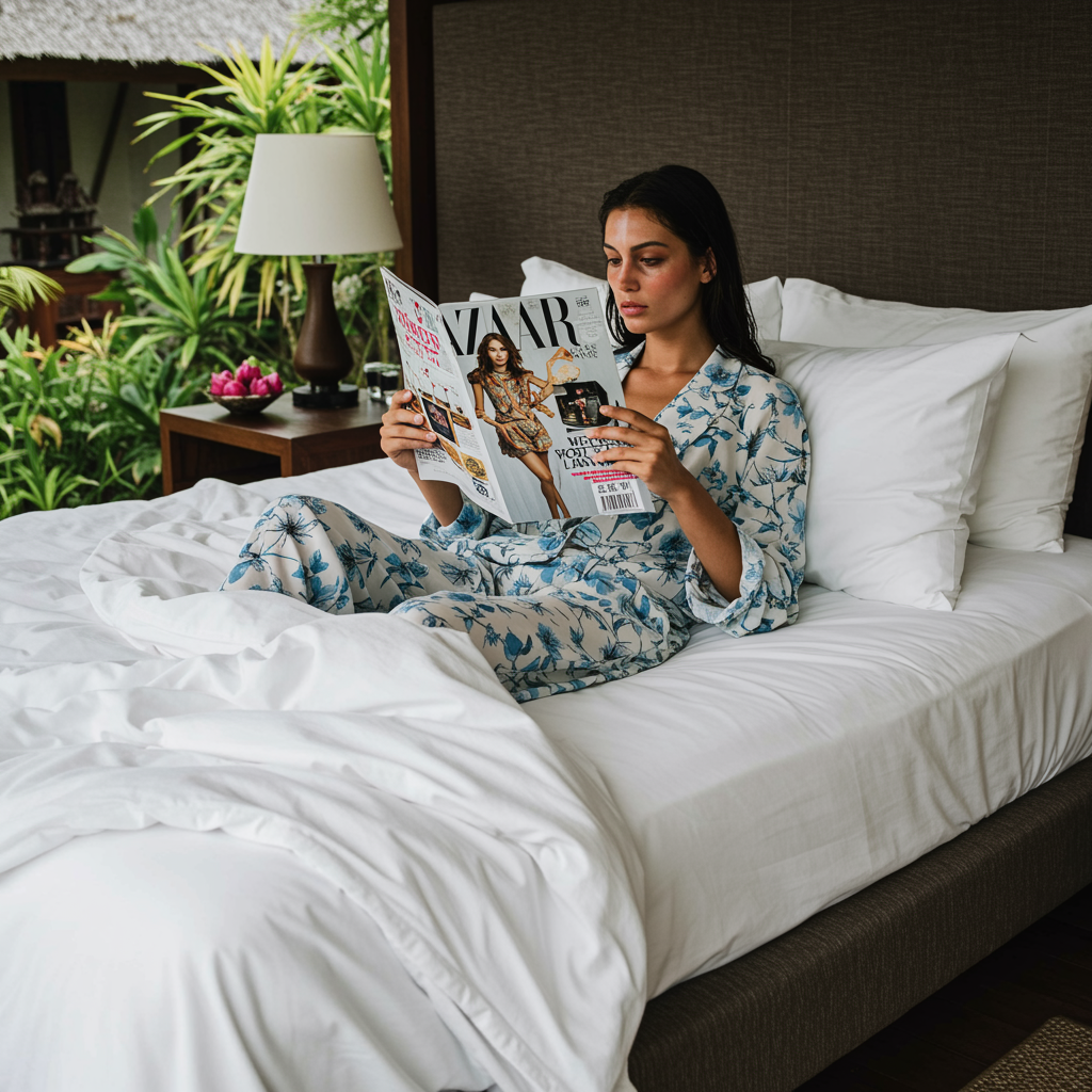 A woman reclines gracefully on a plush bed with nearly white sheets, bathed in the serene ambiance of Bali. She is deeply engrossed in reading a BAZAAR magazine, surrounded by the tranquility of her retreat. Alexei Tikhomirov captures the scene with meticulous detail: her elegantly dressed figure complements her beautifully unique complexion. Her attire is stylish yet comfortable, exuding an air of carefree sophistication. The photograph's ultra-realistic quality highlights the subtle textures and tones, evoking a sense of peaceful leisure and effortless beauty.