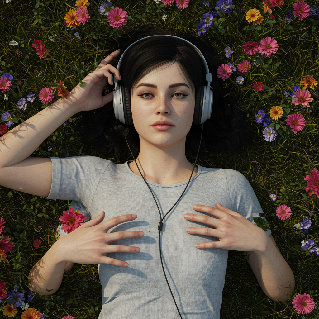 A woman reclines in a field filled with vibrant flowers, headphones resting over her head. Her face is detailed, symmetric, and intricately realistic, evoking a cinematic quality. The scene is highly detailed yet low in resolution, with elements of text and errors. Her hands are subtly flawed, with missing or extra digits, adding to the composition's unique character. The image captures a sense of disarray with jpeg artifacts and a watermark. Anatomy appears off with an extra limb or two, while portions of her form are cropped or out of the frame. Creative imperfections such as blurry details, misshaped elements, and a signature give the piece a raw, untamed aesthetic, blending conventional beauty with a touch of the grotesque.