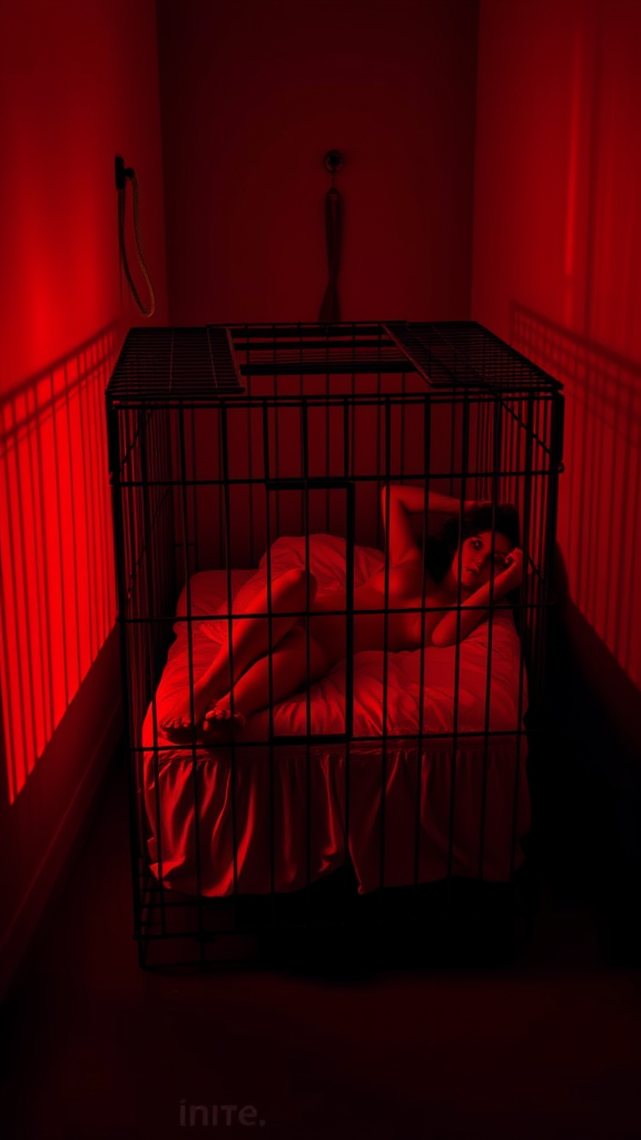 A woman reclines on a bed nestled within a cage, the enclosure set in a dimly lit crimson room, shadows playing on the walls where a whip hangs; a sultry air enveloping the scene, all bathed in the deep, intense hues of red.