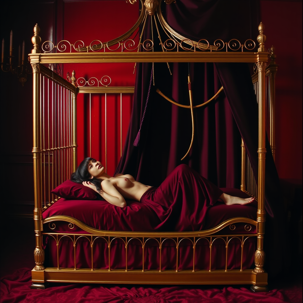 A woman reclines on a bed, the bed enclosed within a gilded cage, surrounded by the rich hues of a dimly lit crimson room; a dark velvet drape accentuates a whip elegantly displayed on the wall.