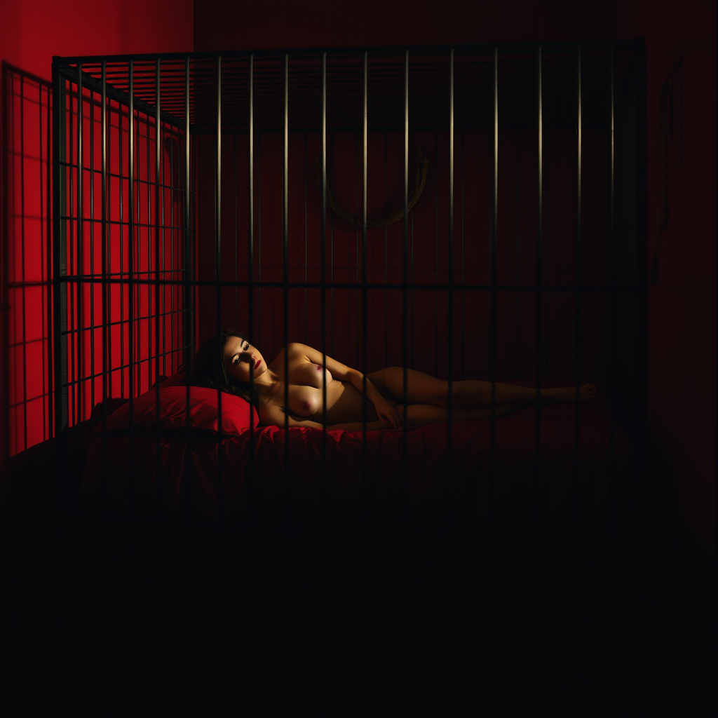A woman reclines on a bed, the bed itself enclosed within a cage in a dimly lit red room, a leather whip artfully hanging on the wall nearby, creating a subtle play of shadows and contrasts.