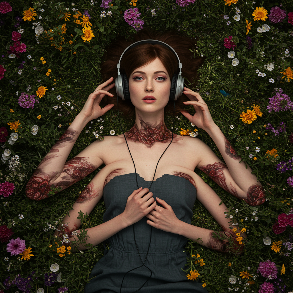 A woman reclining in a field of flowers, wearing headphones over her head, with a detailed and symmetric face. The scene is intricate, realistic, and cinematic, capturing a highly detailed yet low-resolution aesthetic. The image includes text errors, with missing, extra, or fewer digits on her hands. The composition feels cropped with jpeg artifacts and bears a signature causing imperfections. The woman's anatomy appears irregular, with extra or poorly drawn limbs, resulting in a disfigured and out-of-frame appearance. The image includes tiling, with an aspect of bad art showing deformed and blurry elements. The overall scene is fuzzy with misshaped, mutant qualities, appearing gross, ugly, and possibly featuring watermarks.