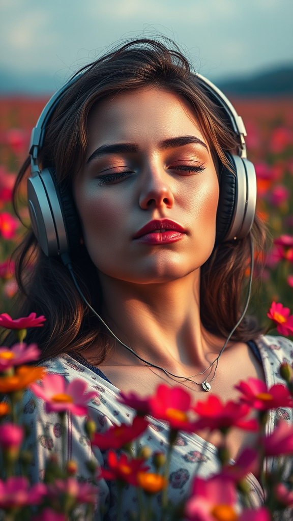 A woman relaxing in a field of vibrant flowers, wearing headphones, with a detailed and symmetric face that exhibits an intricate and realistic expression. The scene is cinematic, capturing a highly detailed yet low-resolution glimpse of serenity. Her position is artistically cropped, highlighting the peaceful landscape. The image contains subtle imperfections, such as jpeg artifacts and text errors. Her anatomy displays unusual characteristics, like extra digits or missing fingers, yet these anomalies blend into a unique composition. The artwork showcases an intriguing combination of beauty and distortion, with elements that are blurry, fuzzy, and slightly disfigured, creating an abstract and unconventional visual experience.