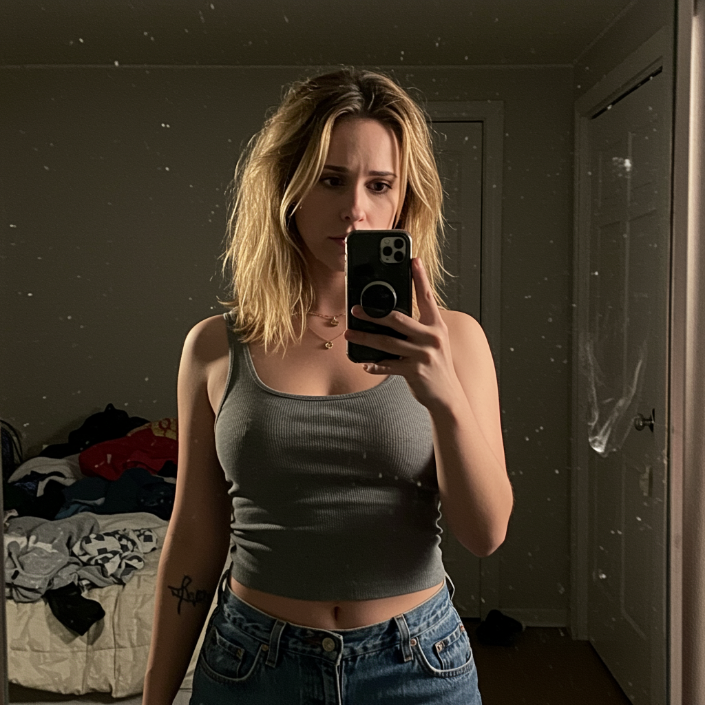A woman reminiscent of Jennifer Love Hewitt stands in front of a mirror taking a selfie. The image quality is intentionally grainy, and a slight blur softens the details, contributing to its genuine and unrefined aesthetic. The lighting in the dim room casts subtle shadows, partially hiding her features. The background introduces a sense of everyday chaos, showcasing clothes scattered on the unkempt bed and a haphazardly draped blanket. Her expression is one of casual concentration, with an old smartphone struggling to focus, enhancing the photo's authentic, candid feel. The mirror is marked with smudges and fingerprints, adding layers to the raw, lived-in ambiance of the scene.