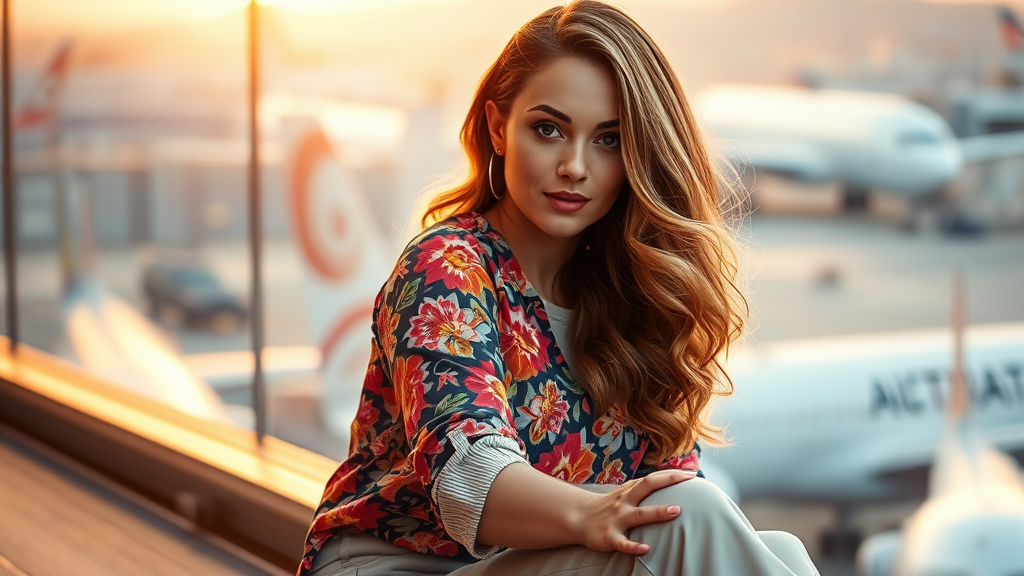 A woman sits gracefully, her body subtly angled to her left, gazing at the camera with a serene expression. Her right arm rests leisurely beside her, while her left arm is bent, her hand gently placed on her thigh. Cascading over her shoulders, her wavy hair shines with a hint of golden hue. She is dressed in a vibrantly patterned blouse with sleeves casually rolled up, paired with light-colored trousers. The background is softly blurred, revealing a glimpse of airplanes and airport equipment, all enveloped in the warm, ethereal light of early dawn, casting a peaceful ambiance.