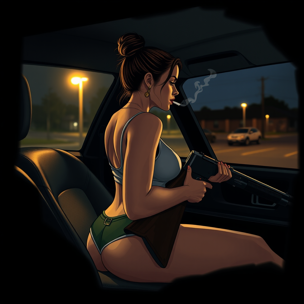 A woman sits inside a dimly lit car, gripping a sawed-off shotgun. Her tank top and shorts reveal a curvy silhouette, accentuated by the soft glow of a streetlight filtering through the window. She casually exhales a plume of smoke, her long hair tied up in a sleek bun. The calming hues of her surroundings blend with deep shadows, highlighting the high contrast between her and the muted colors of the car's interior. The edges of the scene are dark and defined, as if sketched in bold lines. Outside, an evening parking lot sets an atmospheric backdrop, casting an air of mystery and anticipation.