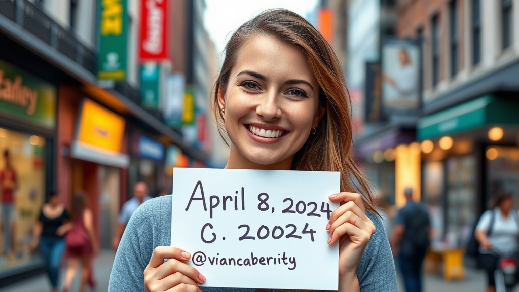 A woman smiles into the camera, holding a small hand-painted sign displaying the date "April 8, 2024" alongside her online handle, standing against a vibrant cityscape backdrop that captures the colorful energy of a bustling street.