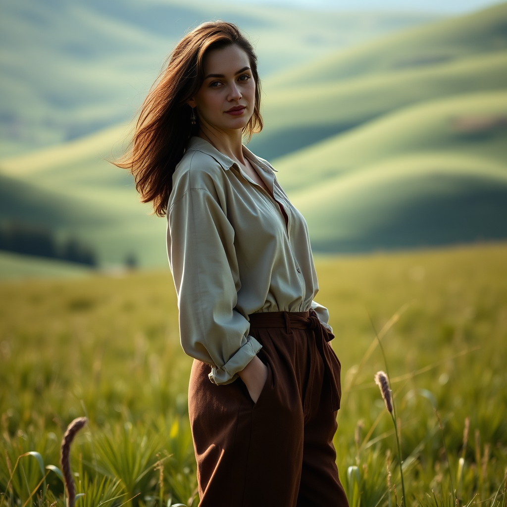 A woman standing gracefully in a lush green field, embodying an outdoor fashion shoot vibe against the backdrop of rolling Scottish landscapes, bathed in soft natural lighting. Her outfit combines elements of light navy and rich dark brown, creating a harmonious blend with the environment. Photographed using a Sony A7III, the image captures the essence of tranquility and style, with subtle creative touches enhancing the texture of her attire and the depth of the surrounding scenery.