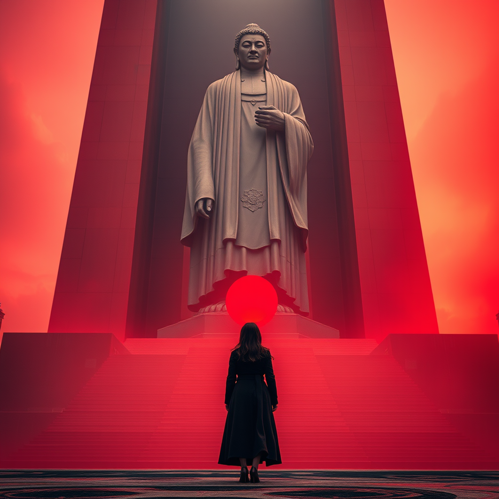 A woman stands before a monumental statue, enveloped in the grandeur of a cinematic set, evoking the styles of Fenghua Zhong and Alessio Albi. The scene is awash in rich hues of red and gray, reminiscent of Cliff Chiang's vibrant artwork, with a meticulous attention to detail akin to a masterful film or video production. The atmosphere is one of awe and reverence, as the interplay of colors and shadows creates a striking contrast, highlighting the woman's poised and contemplative presence against the towering sculpture.