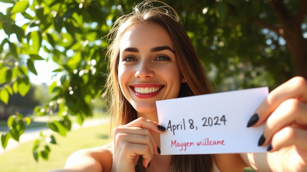 A woman stands confidently, capturing a selfie with a radiant smile. In her hand, she holds a neatly folded piece of paper, with the date "April 8, 2024" and her unique username elegantly scripted below. Sunlight filters through nearby leaves, casting playful shadows across her face, adding warmth and depth to the scene.