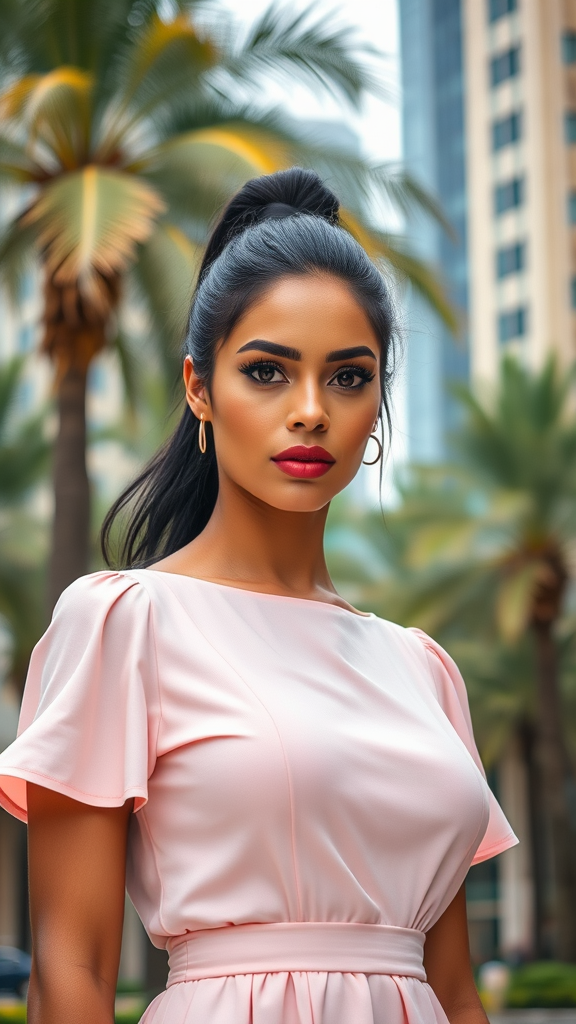 A woman stands confidently facing the camera, her head slightly tilted, her gaze captivating and direct. Her dark hair is swept back into a high ponytail, with a few delicate strands framing her face. Her makeup subtly accentuates her striking eyes, highlighted by well-defined eyebrows. She is dressed in a pastel-colored summer dress, appropriate for a professional setting, echoing the vibrant energy of a tropical city like Dubai or Taipei. In the background, you can spot exotic palm trees swaying in the warm, humid breeze. Her skin, a rich Middle Eastern tone, appears radiant and youthful, thanks to the nourishing cosmetics she uses. The city and her ensemble exude an aura of sophisticated elegance amidst a lively, tropical environment.