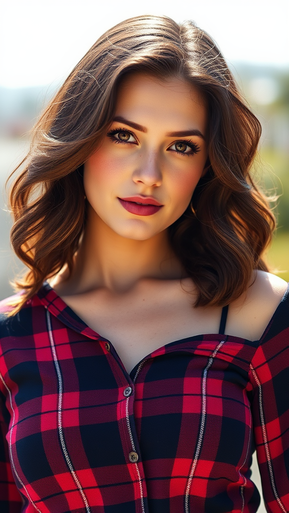 A woman stands confidently, her head tilted slightly to the left as she gazes directly into the camera, exuding curiosity and self-assurance. Her dark brown, wavy hair frames her fair complexion, accentuated by delicate freckles. Her warm amber eyes shimmer with a gentle, inviting light. Sheβs dressed in a tartan plaid ensemble of deep navy and rich crimson intersected by slender white lines, with the neckline playfully draped off her right shoulder. The scene is bathed in vibrant natural light, lending an airy, serene ambiance.
