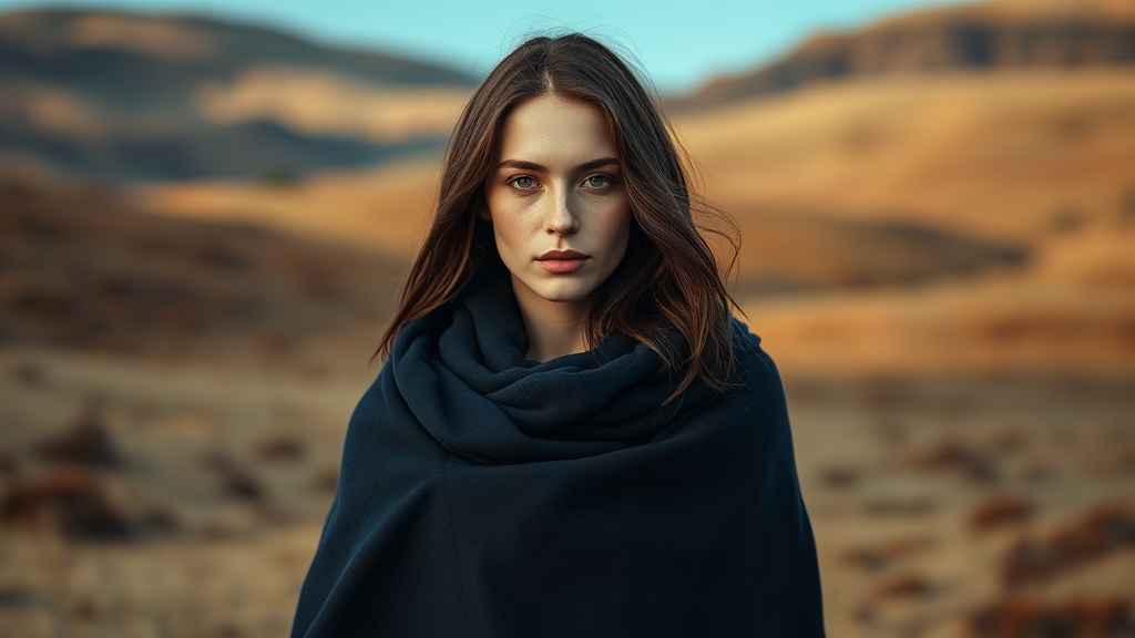 A woman stands gracefully in a rolling Scottish landscape, her attire primed for the camera in the distinct style of Daria Endresen and Kris Knight. She is enveloped in hues of light navy and dark brown, reminiscent of Georg Jensen's timeless elegance. The scene captures intense close-ups, emphasizing her serene expression and the texture of her clothing against the matte landscape. In the background, the soft hills and earthy tones blend harmoniously, enhancing the visual poetry of the moment.