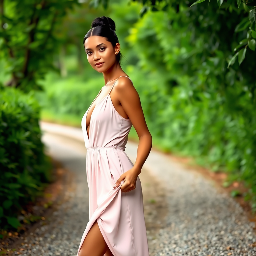 A woman stands gracefully on a winding gravel path enveloped by lush greenery, donning an elegant blush pink sleeveless dress with delicate spaghetti straps and a plunging V-neckline. Her pose exudes confidence, with her right hand resting on her hip and her left hand gently lifting the hem of the dress to reveal a glimpse of her right leg. Her head tilts slightly to the left, complemented by a serene yet assertive gaze, her hair styled in a chic bun, and a subtle, knowing smile playing on her lips.