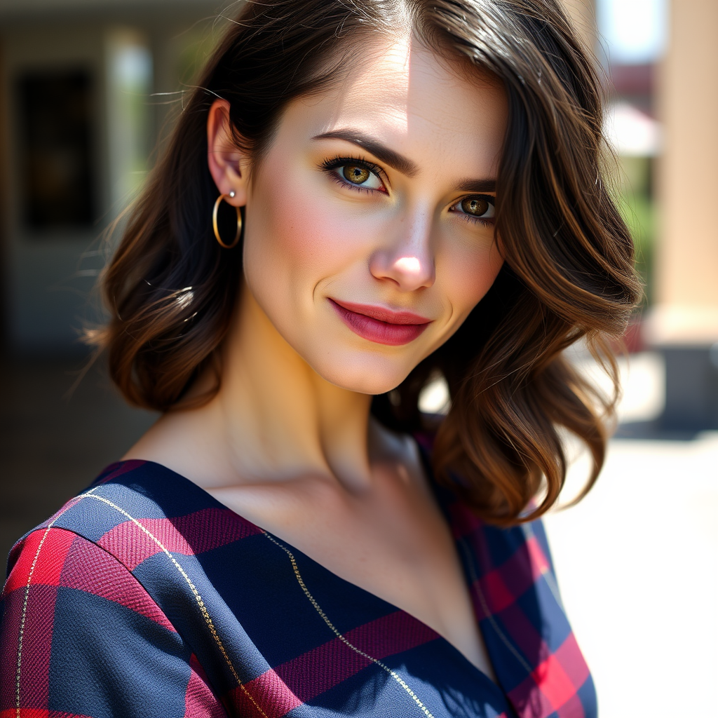 A woman stands in a relaxed pose, her head gently tilted to the right, her gaze engaging the camera with a mix of confidence and curiosity. Her dark brown, wavy hair frames her face, contrasting with her fair skin adorned with subtle freckles. Her eyes, a striking amber hue, hold a soft, inviting glow. She wears a navy blue and crimson tartan plaid outfit accented with thin gold lines, with the neckline gracefully draped off her left shoulder. The scene is bathed in bright natural light, enhancing the warmth and vibrancy of the moment.