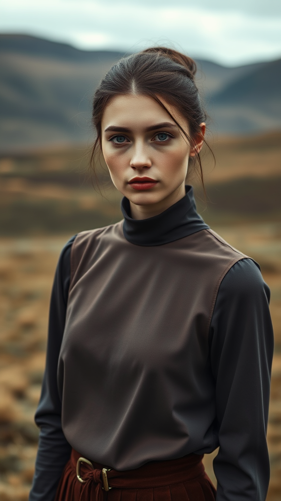 A woman stands in a vast Scottish landscape, her attire meticulously styled for the lens, reminiscent of Daria Endresen's ethereal touch and Kris Knight's delicate portraiture. Her ensemble, a harmonious blend of light navy and dark brown, evokes the elegant simplicity of Georg Jensen designs. The scene captures the intensity of an intimate close-up, the matte finish accentuating every detail, as the camera frames her against the sweeping backdrop of the highlands. Her gaze, serene yet profound, mirrors the timeless beauty of the rolling hills, blending artistry and nature seamlessly.