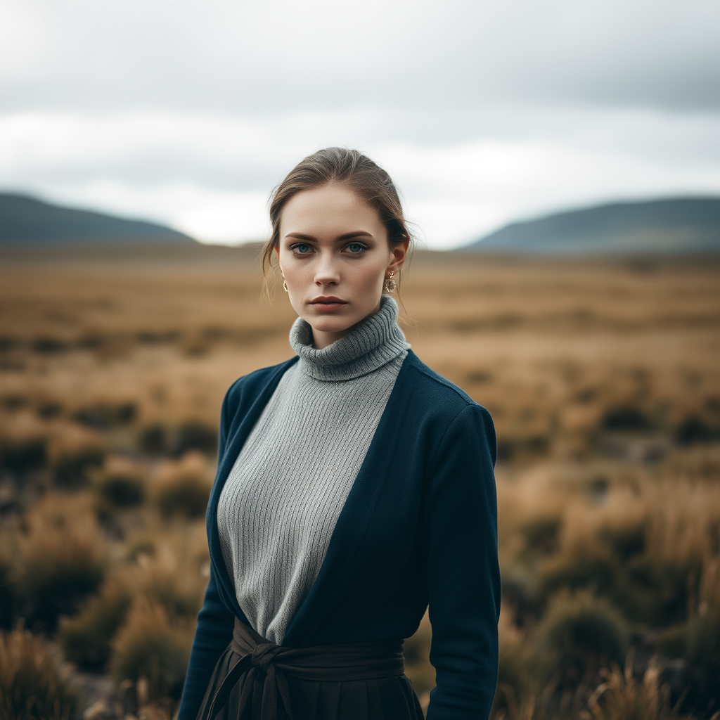 A woman stands poised in an expansive field, her attire meticulously curated for the lens, echoing the ethereal aesthetics of Daria Endresen and Kris Knight. She is enveloped by the rugged charm of Scottish landscapes, her clothing a harmonious blend of light navy and dark brown hues. The influence of Georg Jensen is subtly evident in her understated yet elegant accessories. The composition features intense close-ups that capture her enigmatic gaze and serene expression. The matte finish of the photograph adds a timeless quality to the scene, underscoring the atmospheric interplay between subject and landscape against the backdrop of the wild, natural setting.