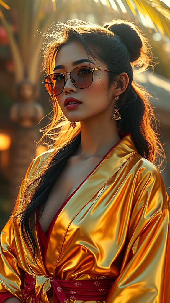 A woman stands shimmering in a glossy golden kimono, bathed in warm sunlight, evoking cyberpunk realism with an enigmatic tropical ambiance. Her presence captures the essence of glamorous Hollywood with photorealistic precision and detailed character illustration. Neon digital highlights, reminiscent of Artgerm and Wong Kar-wai's styles, accentuate the metallic elements of her attire. The close-up reveals intense detail, with rays of light adding a dynamic, explosive quality. Influences from digital manipulation artists like Tanya Shatseva and Daniel F. Gerhartz blend with rich hues of dark pink and light blue, creating intricate imagery. The scene unfolds in ultra-high definition, drawing viewers into its captivating allure.