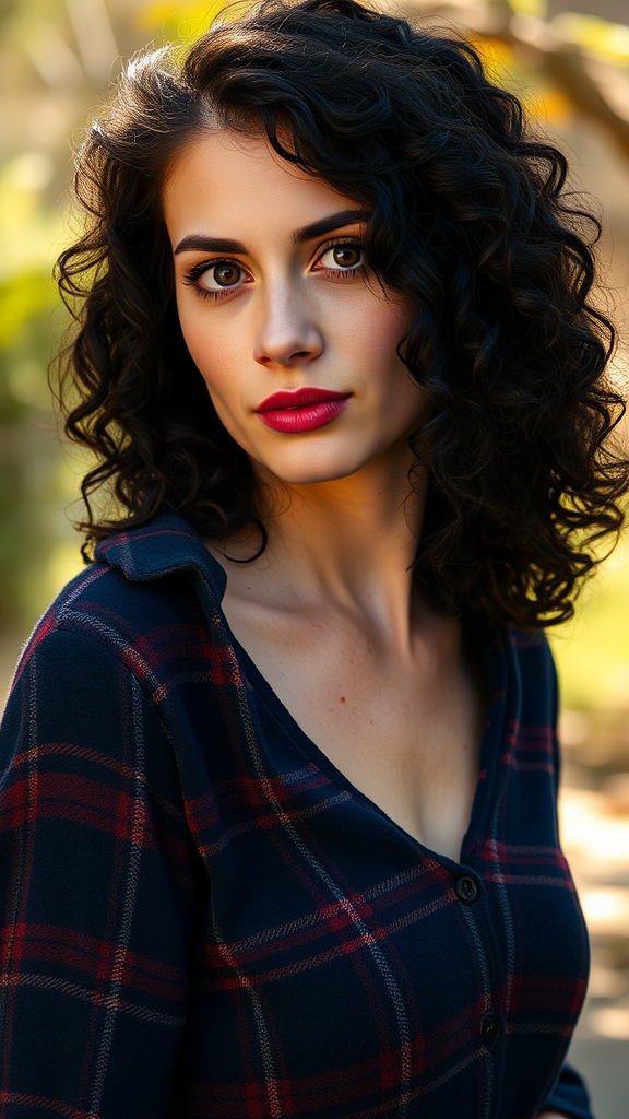 A woman stands slightly angled, her head turned gently to the right, peering into the camera with an air of self-assured curiosity. Her dark chocolate, curly tresses cascade around her face, complementing her fair complexion adorned with a sprinkling of freckles. Her eyes, a captivating shade of amber, shimmer with a warm, welcoming glow. She is dressed in a tartan plaid garment, featuring rich tones of navy blue and deep crimson interlaced with subtle white stripes, the neckline draping slightly off her left shoulder. The scene is bathed in the soft, radiant wash of natural sunlight.