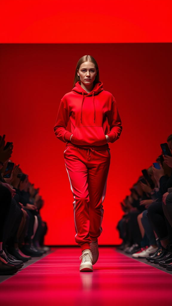 A woman strides confidently down the runway in a striking red hoodie and matching sweatpants, set against a vivid crimson backdrop. Her serious expression complements the bold, modern atmosphere as the silhouettes of the captivated audience frame the scene, lending an air of mystery and sophistication.