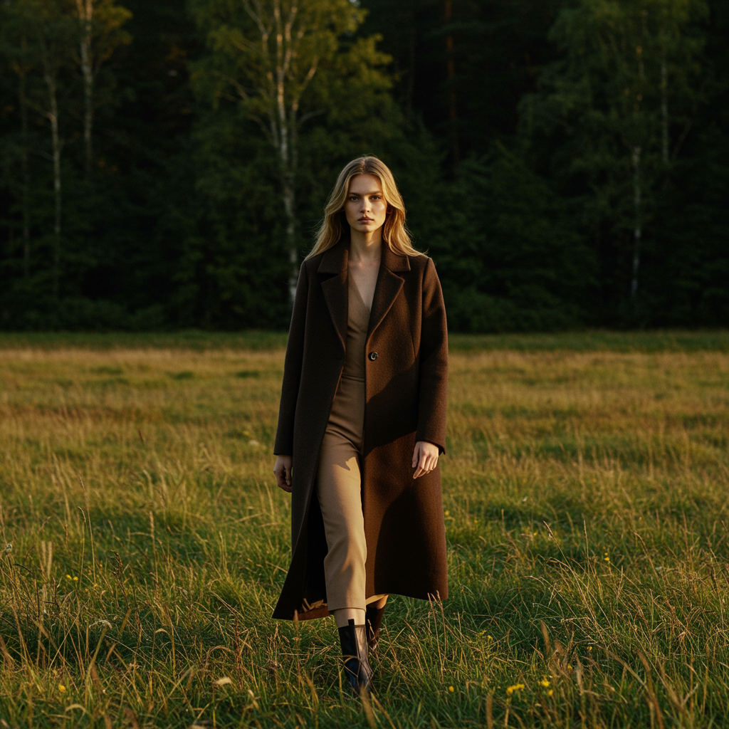 A woman strides confidently through a verdant field, embodying a vogue fashion photo aesthetic. She wears an elegant brown truffle coat that catches the sunlight. The backdrop is a breathtaking Swedish forest, reminiscent of cinematic scenes from Dune 2020. Her style echoes Britt Marling's effortless grace in a 3/4 profile, captured with the precision of Patrick Demarchelier. The atmosphere evokes the introspective energy of the Tarot card, The Hermit, with sleek and flowing shapes. Artist Cicely Hey's touch infuses the scene with an idyll ambiance, while her taupe ensemble complements her long, sun-kissed blond-brown hair.