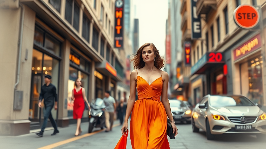A woman strolls down a bustling city street in a vibrant orange dress, exuding the timeless elegance of classic Hollywood glamour. The scene captures candid moments reminiscent of famous figures in art and photography, framed against a minimalist white background. The setting embodies an "aurorapunk" aesthetic, blending whimsical elements with futuristic undertones. The image boasts a stunning 32k ultra-high-definition clarity, echoing the artistry of Man Ray with attention to detail and contrast. It reflects a classical academic style, infused with a warm color palette inspired by Jonas Burgert's work, creating an inviting and elegantly formal atmosphere. The composition is cute and expressive, emphasizing the scenic allure of urban life.