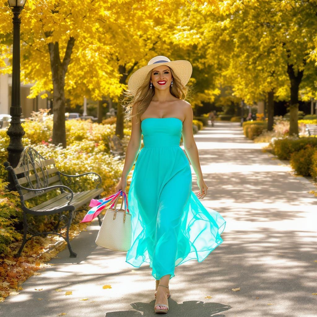 A woman strolls gracefully on a sunlit pathway lined with lush trees, a vintage wrought-iron park bench nestled off to the side. She wears an elegant wide-brimmed hat that casts playful shadows on her face, her strapless turquoise sundress fluttering in a gentle breeze. A colorful silk scarf is tied around the handle of the large purse draped over her arm, and her stylish wedges click softly against the warm pavement. Her smile is bright and joyful, reflecting the golden rays of the sun that dance around her on this perfect, carefree day.