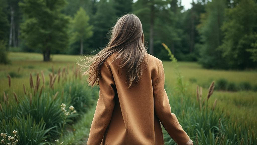 A woman strolls through a verdant field, her brown tuffle coat contrasting with the lush greenery of a Swedish forest. The scene captures a sense of serene elegance akin to a vogue fashion photo. The aesthetic echoes a film still from Dune 2020, with a nod to Britt Marling's style. The image, reminiscent of Patrick Demarchelier's work, embodies the essence of the tarot card The Hermit. Sleek, flowing shapes envelop her as her taupe and blond brown long hair cascades down her back. The idyllic setting, captured by Cicely Hey, captivates with a sense of tranquility and grace, marked by a harmonious fusion of nature and fashion.
