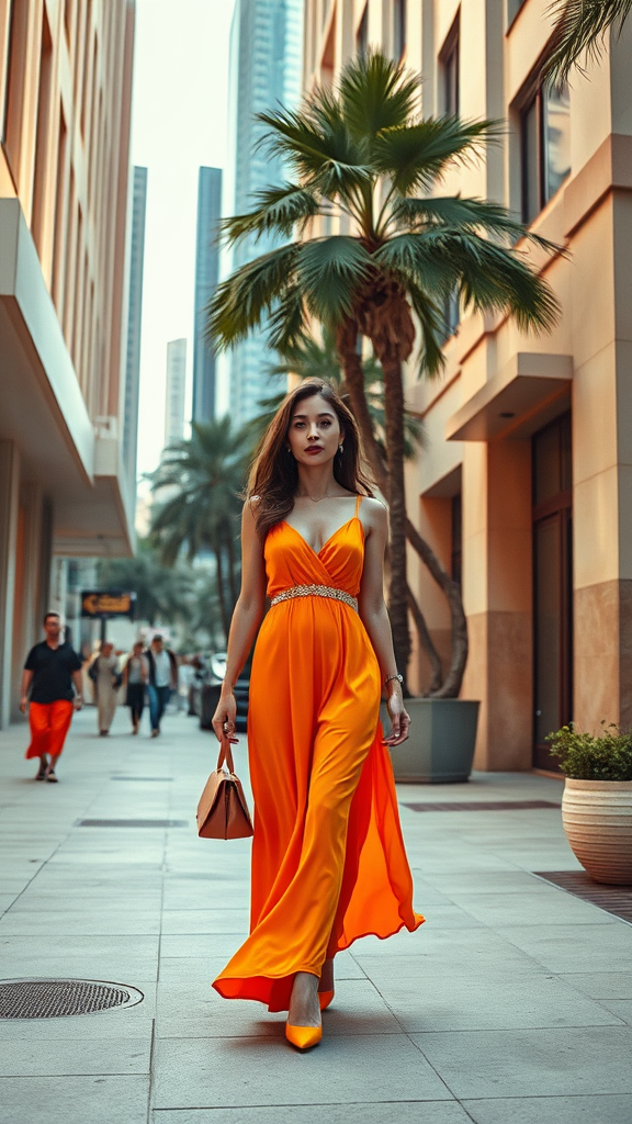A woman strolls through an urban landscape wearing a vibrant orange dress, her presence echoing the classic Hollywood glamour style captured in candid moments of legendary figures. The imagery unfolds against a pristine white backdrop, infused with an aurorapunk aesthetic. The scene is rendered in stunning 32k UHD quality, reminiscent of Man Ray's iconic visuals and classical academic artistry. A warm color palette envelops the composition, enhanced with the expressive touch of Jonas Burgert. The scene is elegantly formal yet infused with a playful charm, presented in a 2:3 aspect ratio. The overall atmosphere is both scenic and inviting, capturing a cute and expressive essence.