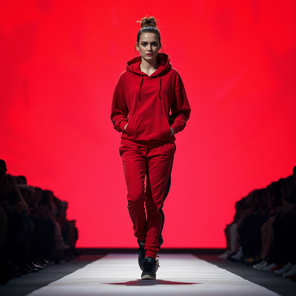 A woman struts down the runway clad in a crimson hoodie and matching joggers, with a fierce expression on her face. The background is a vivid, fiery red, casting a daring vibe across the scene. The audience is silhouetted, mere shadows against the intense backdrop, adding to the modern and daring atmosphere.