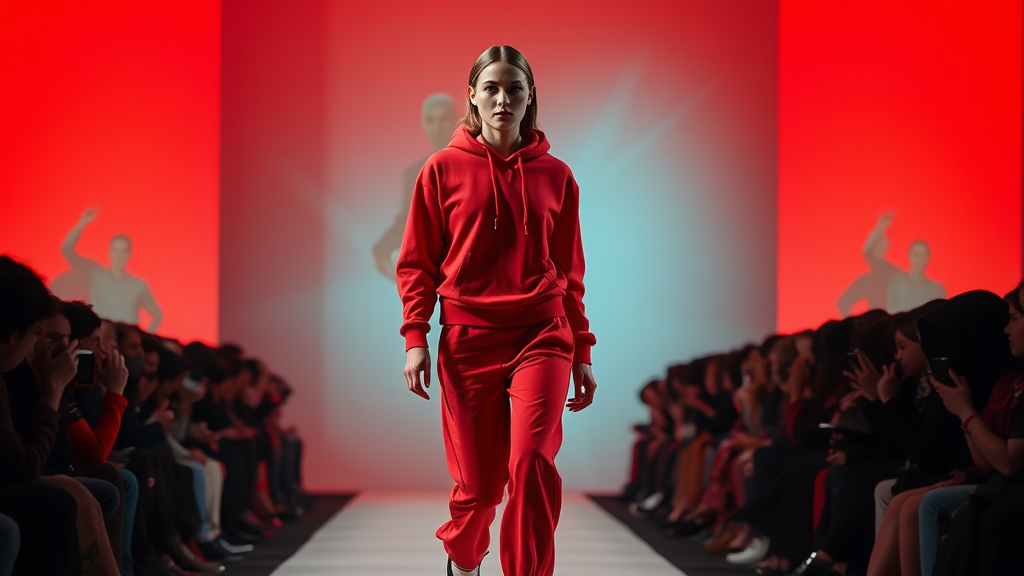 A woman struts down the runway in a striking crimson hoodie and matching sweatpants, the vibrant red backdrop amplifying her serious expression. The audience is cloaked in shadow, enhancing the bold and contemporary ambiance of the scene.