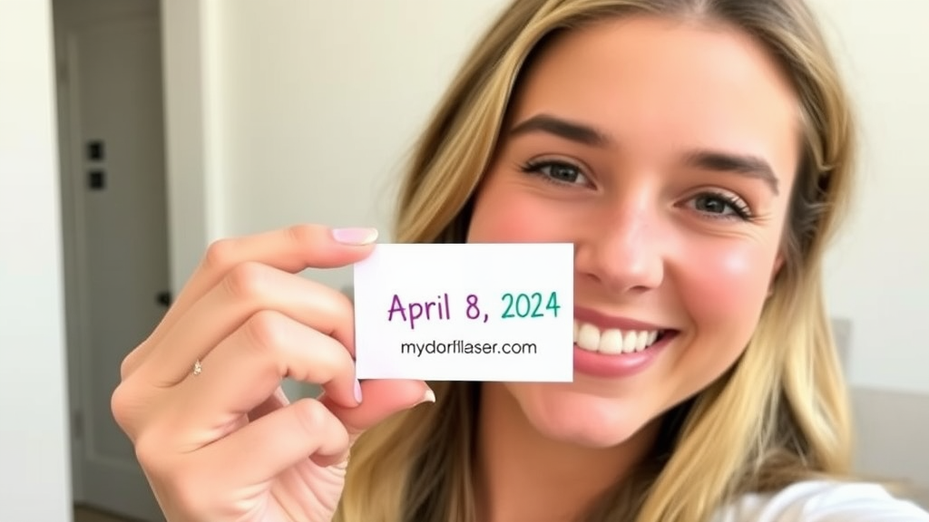 A woman takes a selfie, smiling warmly at the camera, while holding a small card that displays the date "April 8, 2024" along with her personal username written beneath it in playful, colorful letters.