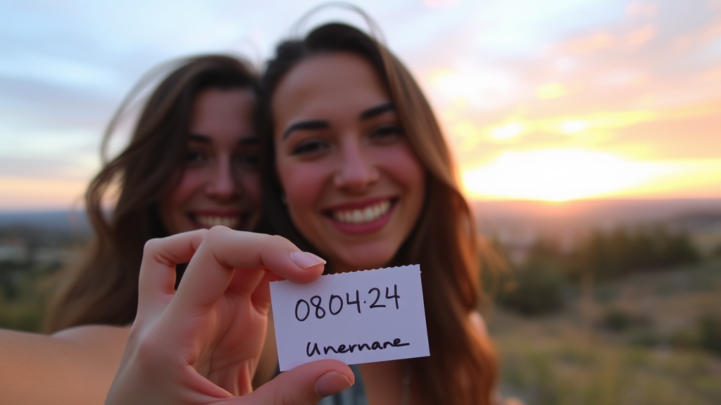 A woman takes a selfie with a small handwritten note in her hand displaying the date "08-04-24" alongside her username, her smile reflecting joy while a beautiful sunset paints the sky in the background.