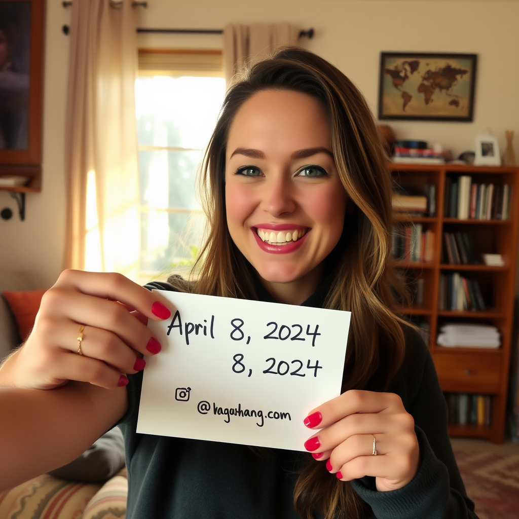 A woman taking a selfie, smiling brightly, holds a handwritten note that reads "April 8, 2024" along with her social media handle. She is in a cozy room with a bookshelf in the background, and sunlight filters gently through the window, casting a warm glow. The scene conveys a sense of anticipation and personal expression.
