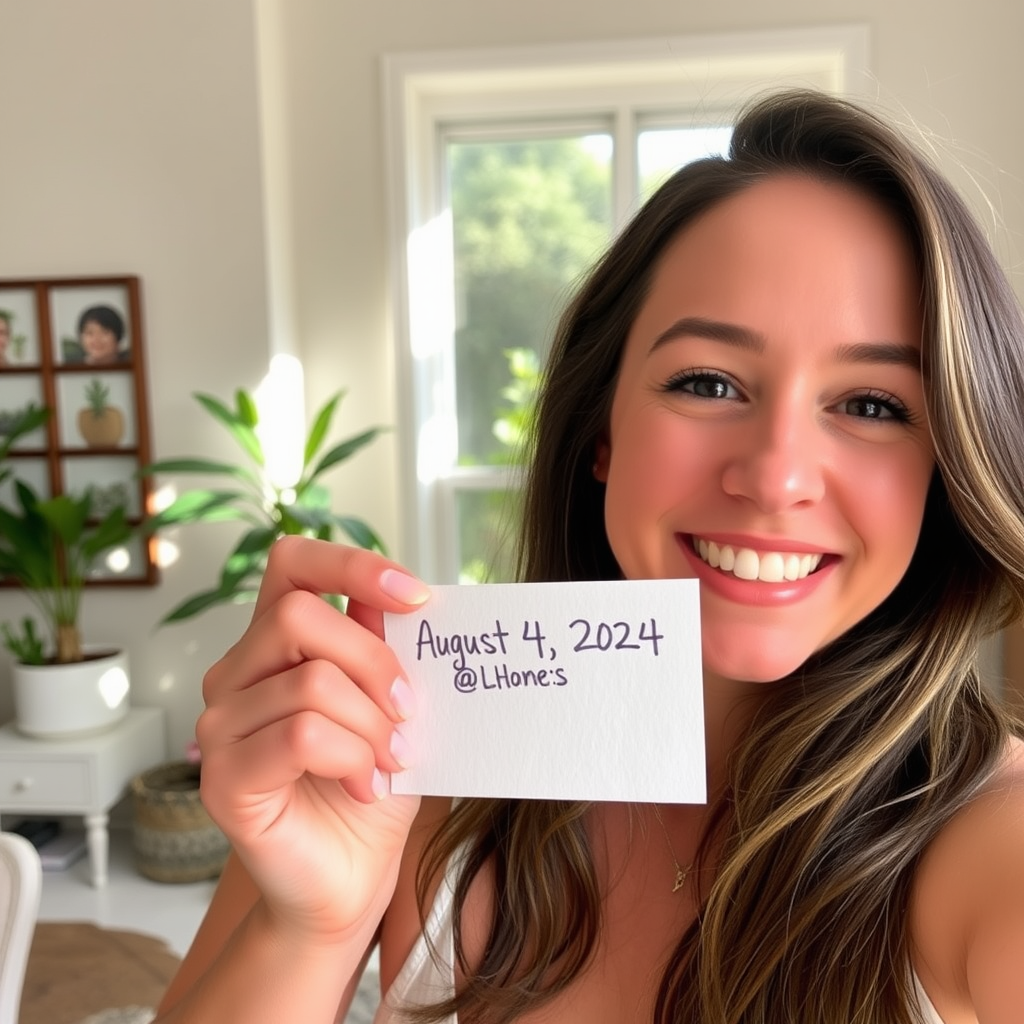 A woman taking a selfie, smiling warmly at the camera, as she holds up a small, handwritten note displaying the date "August 4, 2024" alongside her online handle. The background features a cozy, sunlit room with potted plants gently catching the light.