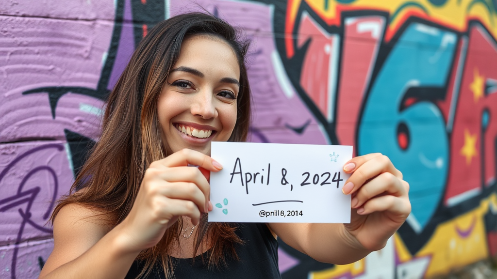 A woman taking a selfie while smiling, holding a neatly written card displaying the date "April 8, 2024" with her username beneath it, standing against a colorful graffiti wall that adds an artistic touch to the composition.