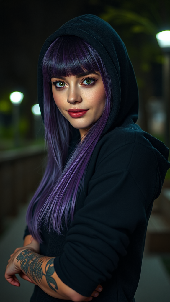 A woman wearing a black hoodie with an arm tattoo and long purple hair featuring bangs and big green eyes stands in a park at night. Her small smile and seductive look are highlighted by the dim lights. Captured in an 8k ultra HD portrait style using a Nikon Z9, the scene is realistic with raytracing effects. The detailed background provides depth to the image. The focus is on her face, ensuring clarity and detail, while intentionally avoiding any text, watermarks, or signatures. The composition centers on her expressive eyes and confident pose, creating an engaging and mysterious atmosphere.