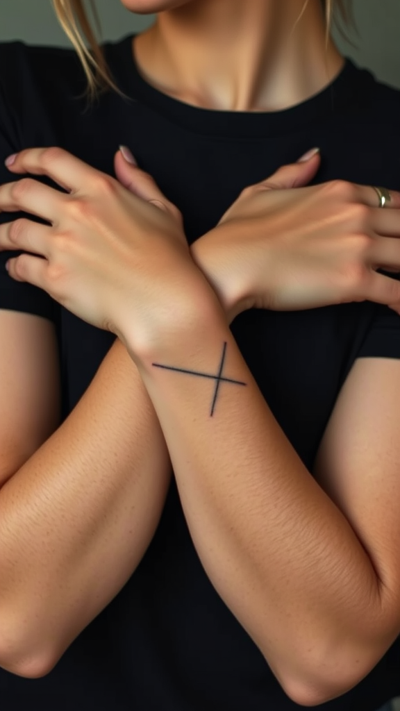 A woman wearing a black shirt, her arms elegantly folded, depicted in tattoo style with an emphasis on the intricate connections at her joints. The design features a blend of dark silver and dark gold, exuding a normcore yet effortlessly chic vibe. Elements of happycore are interwoven with a palewave color palette, capturing a serene yet vibrant energy. The overall composition maintains a slender vertical aspect ratio.