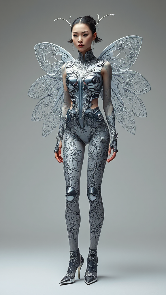 A woman wearing a reflective chrome vest and an intricate costume that melds seamlessly into sleek shoes, designed in a style that blends cybernetic surrealism with womancore aesthetics. Her form is a realistic rendering but intriguingly comprised of swirling, intricate patterns resembling interconnected insects. The palette plays on the nuances of dark white and light black, bringing a subtle contrast that highlights the flowerpunk essence. The atmosphere exudes a raw, otherworldly allure, capturing a unique fusion of nature and futuristic elements.